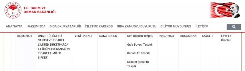 Bakanlığın resmi sitesinde yayınlanan listede yer alan DNC Et Eserleri Sanayi ve Ticaret Limited Şirketi – Arda Et Eserleri Sanayi ve Ticaret Limited Şirketi firma sucuğunda deri dokusu, besin boyası kanatlı et tespiti ve sakatat (baş) eti tespit edildiği bildirildi.